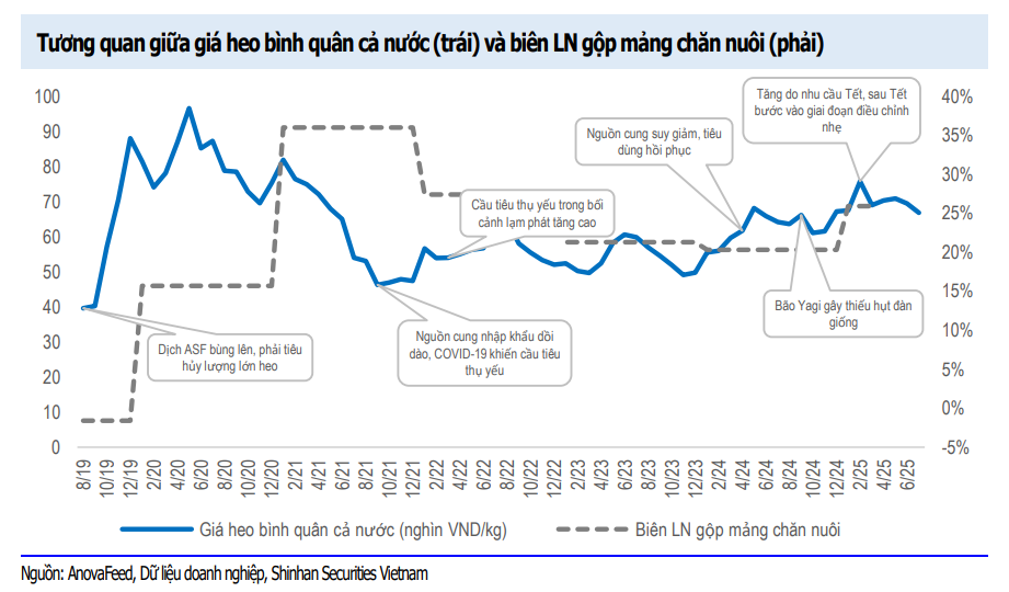 Giá heo rục rịch tăng từ giữa năm 2024, một phần do các quy định về vùng chăn nuôi và tiêu dùng phục hồi, hiện tại đang neo ở mức 67 – 70 nghìn VND/kg. Với tình hình con giống khan hiếm như hiện tại thì nguồn cung sẽ khó tăng mạnh, vì vậy chúng tôi cho răng giá heo được duy trì cho đến hết năm 2025, là một yếu tố hỗ trợ duy trì biên lợi nhuận gộp tốt cho các doanh nghiệp chăn nuôi.