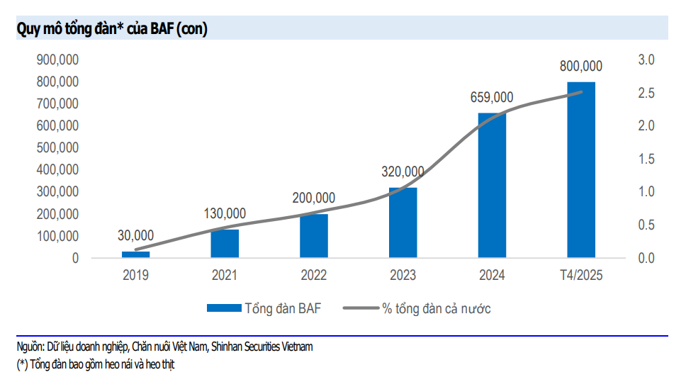 Nhờ tăng cường hoạt động M&A, quy mô tổng đàn của BAF đã tăng trưởng nhanh chóng, tổng đàn tính đến T4/2025 là 800,000 con; trong đó heo nái khoảng 75,000 con – đứng thứ 5 thị trường heo hơi Việt Nam.