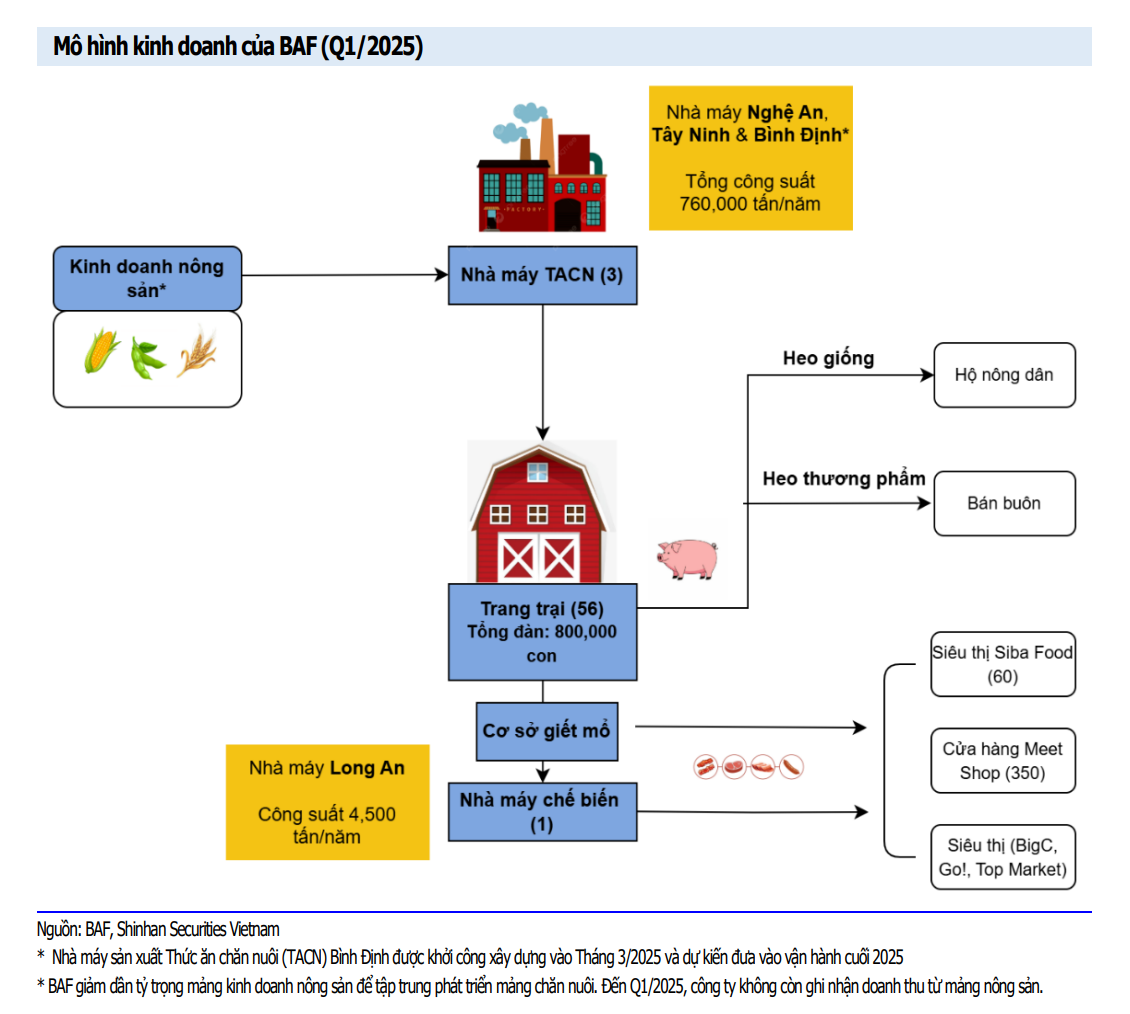 Tính tới Tháng 4/2025, BAF sở hữu 56 trang trại chăn nuôi rải rác trên khắp cả nước, 2 nhà máy sản xuất Thức ăn chăn nuôi (TACN) tại Nghệ An và Tây Ninh với tổng công suất thiết kế là 460,000 tấn/năm; đồng thời vừa khởi công xây dựng nhà máy TACN thứ ba tại Bình Định với công suất 300,000 tấn/năm và dự kiến đi vào vận hành trong cuối năm 2025.