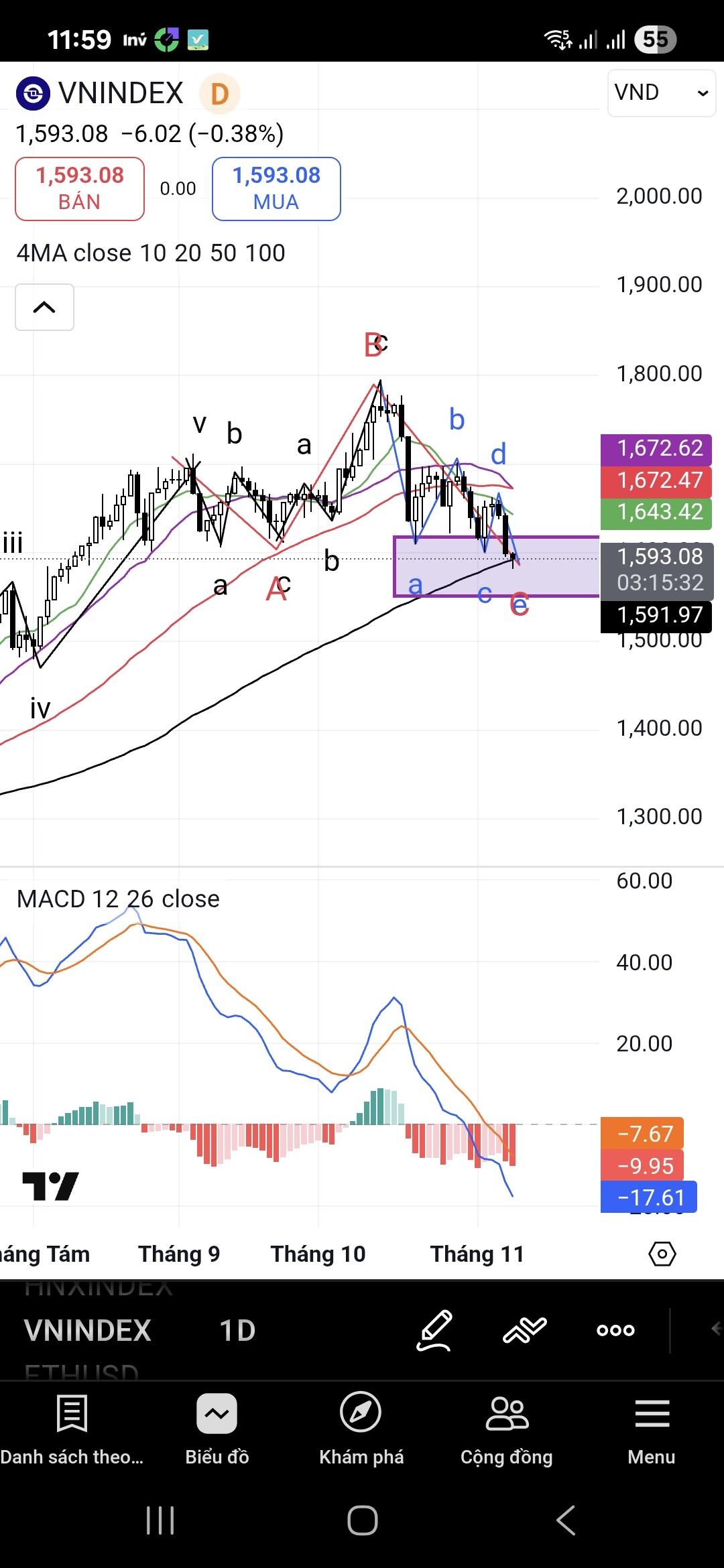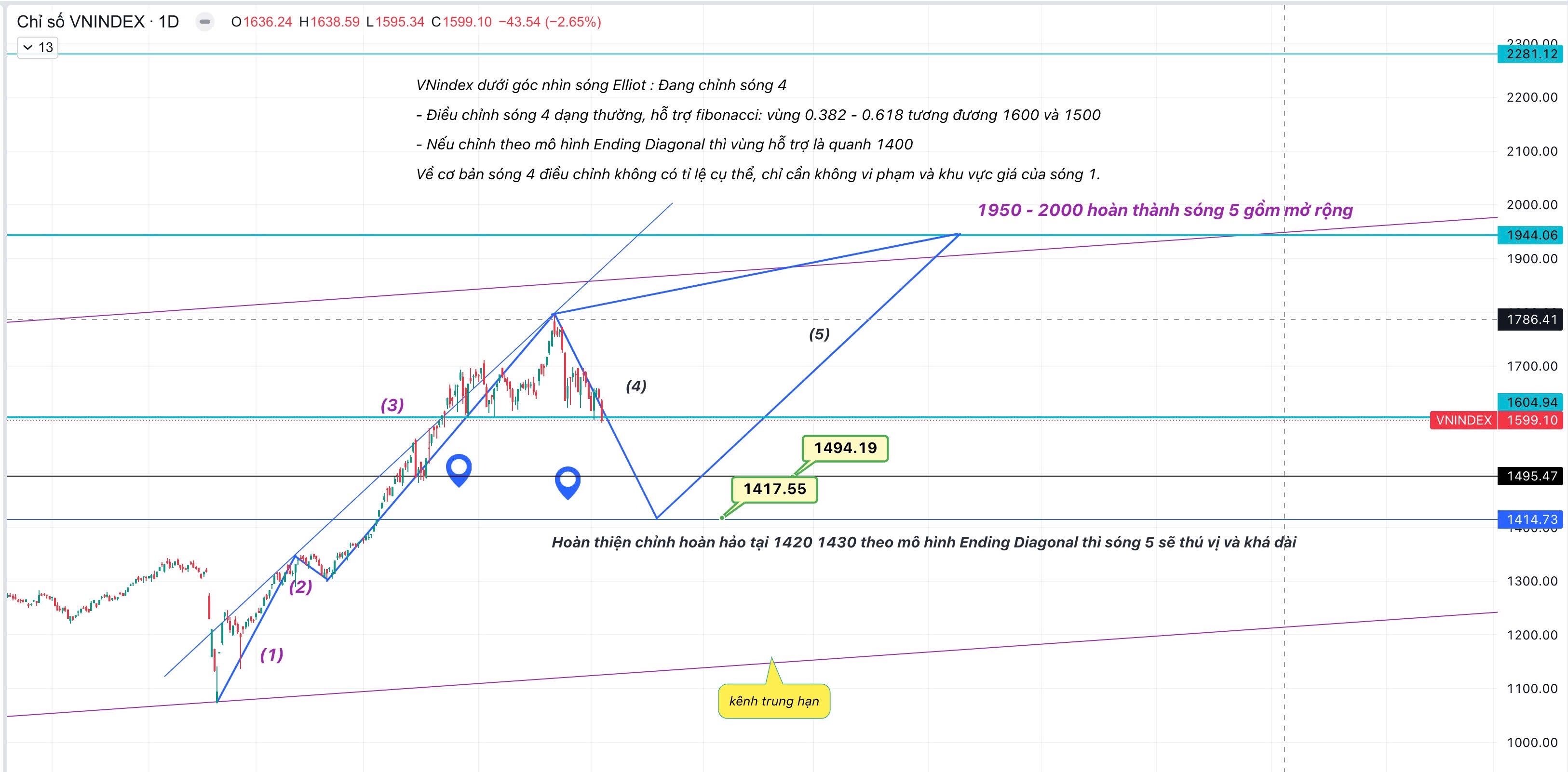 Nếu chỉnh theo mô hình Ending Diagonal thì vùng hỗ trợ là quanh 1400 hoặc sâu hơn về 1280/1300