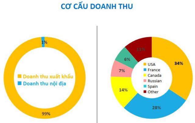 Doanh thu xuất khẩu chiếm tới 99% tổng doanh thu, trong đó Mỹ và Pháp là hai thị trường lớn nhất, lần lượt chiếm 34% và 28% thị phần trong tháng 1.