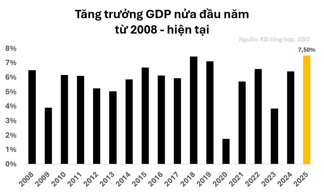 Nhìn vào kết quả tăng trưởng 6 tháng đầu năm, có thể thấy tốc độ tăng trưởng GDP phục hồi rõ trong những năm gần đây. Với kết quả này thì rõ ràng tăng trưởng trưởng kinh tế vẫn đang rất ổn định, nếu duy trì như hiện tại kèm với kiểm soát kinh tế vĩ mô, điều hành tỷ giá và lãi suất tốt thì mục tiêu tăng trưởng GDP 8% trong năm 2025 hoàn toàn là có thể.
