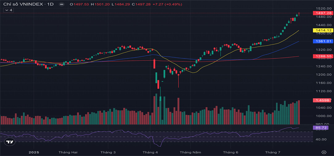 Hỗ trợ gần nhất: 1,450 – 1,470 điểm. Đây là vùng hỗ trợ quan trọng, có thể giữ nhịp thị trường và tạo nền giá mới nếu xuất hiện điều chỉnh kỹ thuật.
