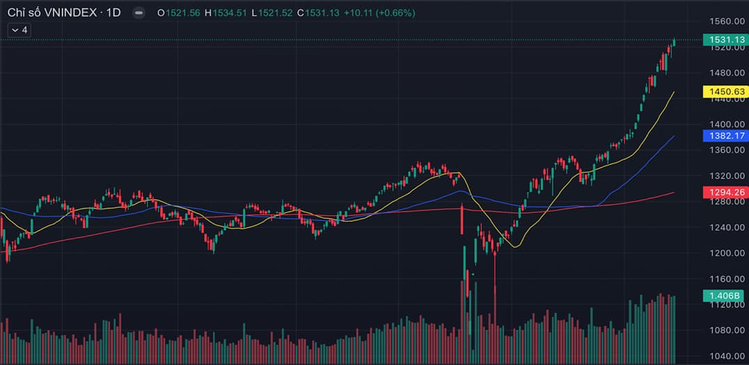 Kháng cự mạnh: vùng 1,530 điểm – đây là vùng đỉnh cũ và cần vượt qua dứt khoát để xác lập xu hướng mới.
