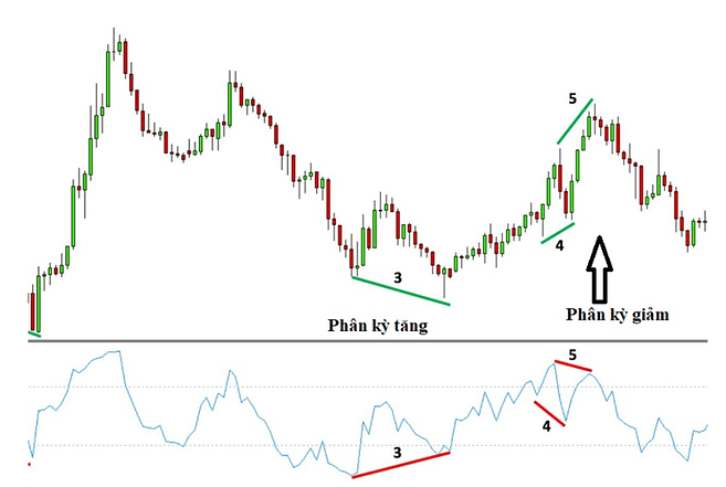 RSI là công cụ hiệu quả để xác nhận khả năng đảo chiều xu hướng thông qua tín hiệu phân kỳ. Phân kỳ RSI xuất hiện khi hướng di chuyển của giá và RSI trái ngược nhau.