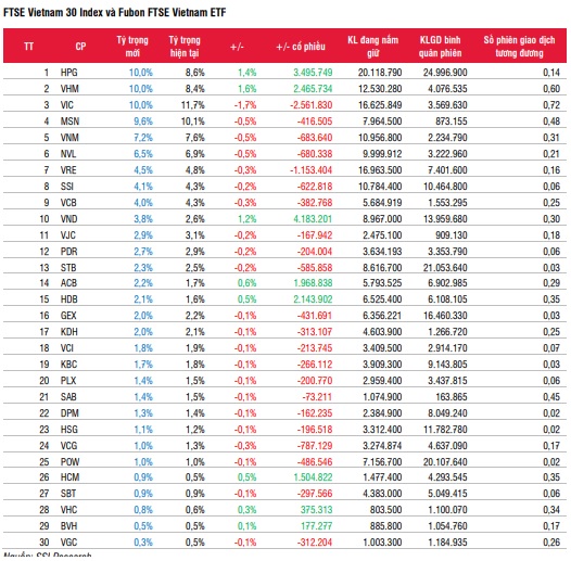 Fubon FTSE Vietnam ETF hiện là quỹ ETF lớn thứ 3 trên thị trường Việt Nam với quy mô tài sản 11,300 tỷ. Do FTSE Russel không công bố danh mục chi tiết của chỉ số FTSE Vietnam 30 Index, bảng ước tính của chúng tôi dựa trên giả định danh mục chỉ số giữ nguyên trong kỳ này.