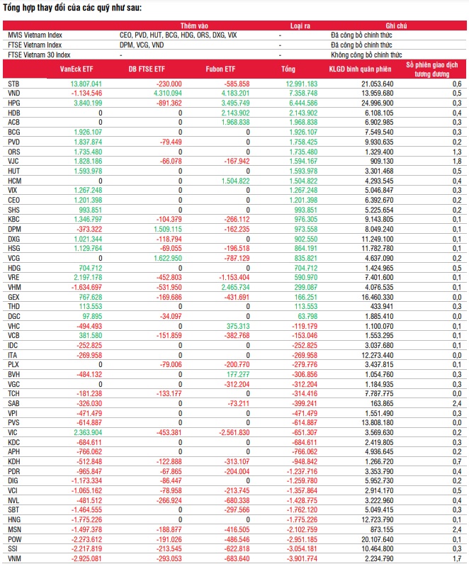 • FTSE Vietnam Index: Thêm DPM, VCG, VND và không loại cổ phiếu nào. Quỹ FTSE Vietnam Swap UCITS ETF ước tính sẽ mua khoảng 4.3 triệu VND, 1.5 triệu DPM và 1.6 triệu VCG trong khi hầu hết các cổ phiếu hiện có sẽ bị giảm tỷ trọng.