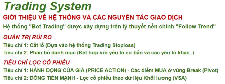 Hiện tại, em đang sử dụng hệ thống Robot lọc cổ phiếu theo 2 tiêu chí chính: (1) Price Action; (2) Dòng tiền mạnh theo phương pháp VSA (Volume Spread Analysis).