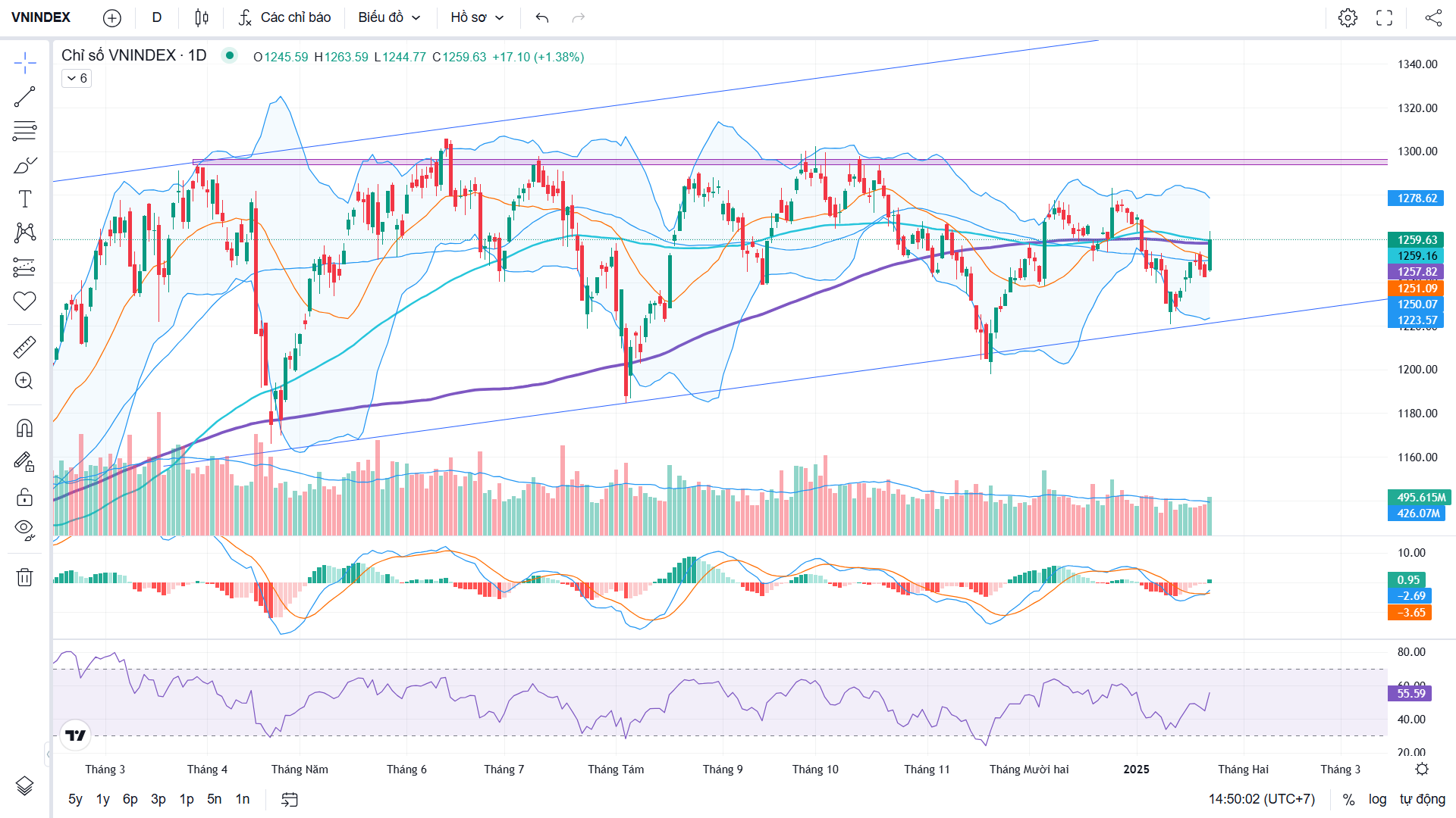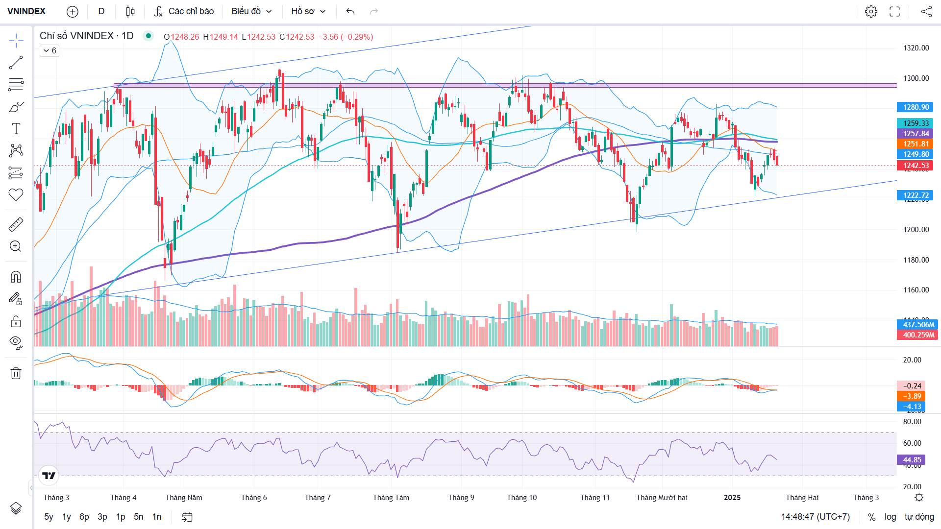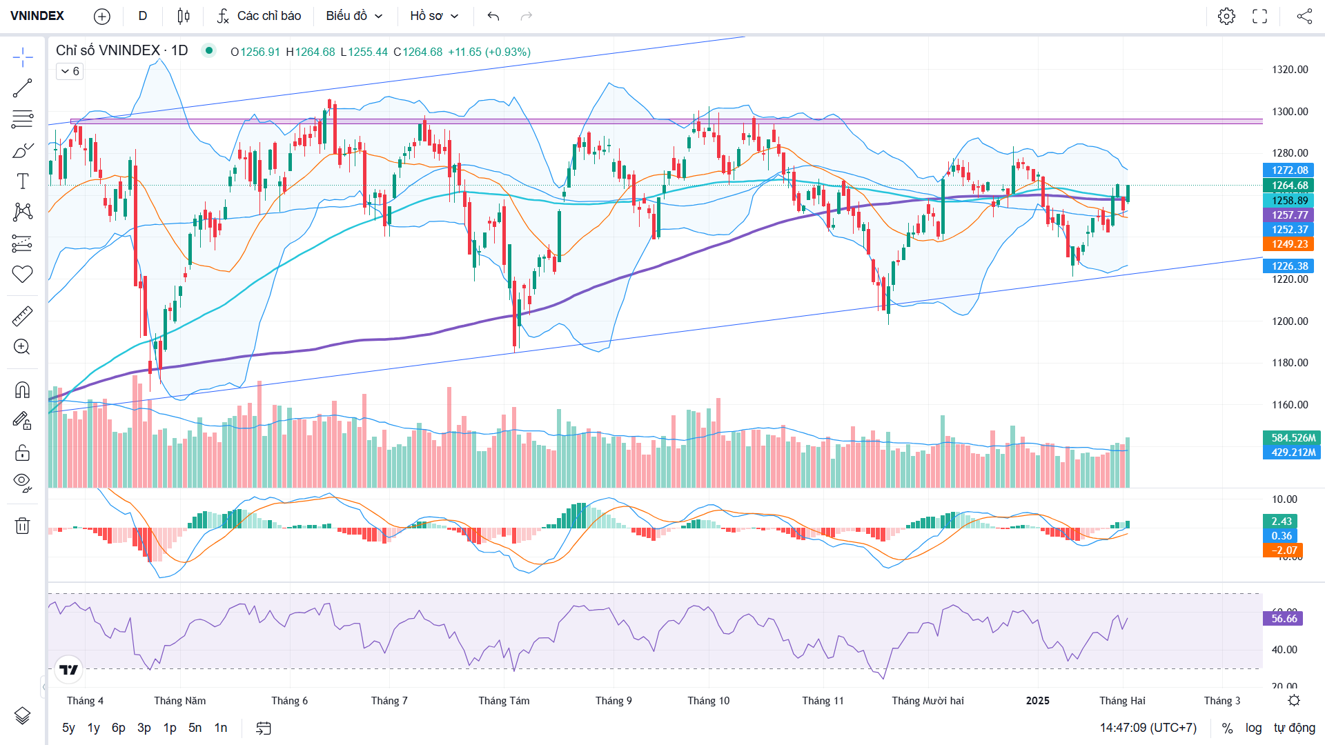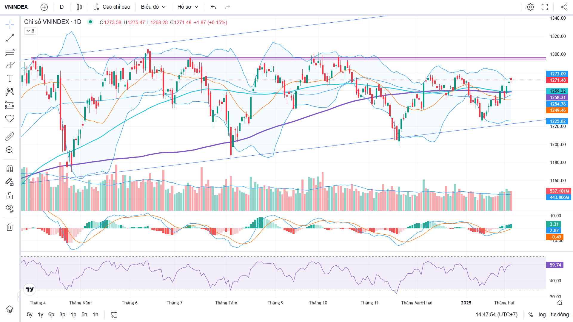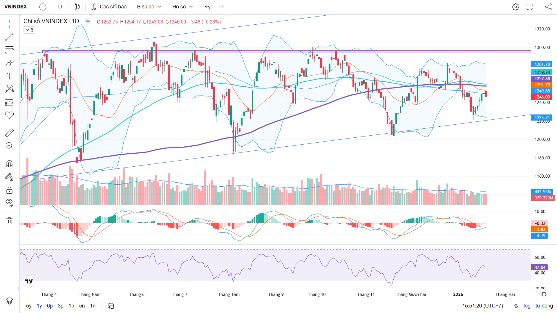 Hôm nay thị trường duy trì trạng thái lình xình với thanh khoản xuống thấp kỷ lục. Giai đoạn cận tết tâm lý NĐT không hào hứng giao dịch nên thanh khoản thấp cũng là điều dễ hiểu. VNI tạm thời vẫn giữ trên hỗ trợ 1240đ và rút chân nhẹ. Phiên mai nếu VNI bứt phá qua 1262đ thì mới chuyển sang trạng thái tích cực, còn không thì vẫn cần chờ đợi thêm.