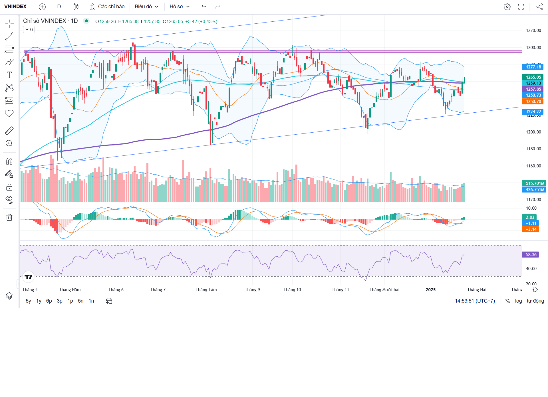Phiên mở màn năm mới 2025 thị trường đóng cửa trong sắc xanh. VNI rung lắc ở giữa phiên về sát MA100 ngày nhưng sau đó hồi phục tạo cây nến rút chân, giữ vững hỗ trợ MA20 ngày tại 1267đ. Điểm trừ là hôm nay thanh khoản chưa có sự cải thiện. Phiên mai VNI tăng trên 1275đ thì sẽ thuận lợi hơn và đủ điều kiện để vào nhịp tăng mới. Còn không thì vẫn cần phải chờ đợi thêm tuần sau. Vì vậy ACE tiếp tục giữ hàng chờ đợi tín hiệu mới, nếu điều chỉnh sẽ có khuyến nghị mua sau.
