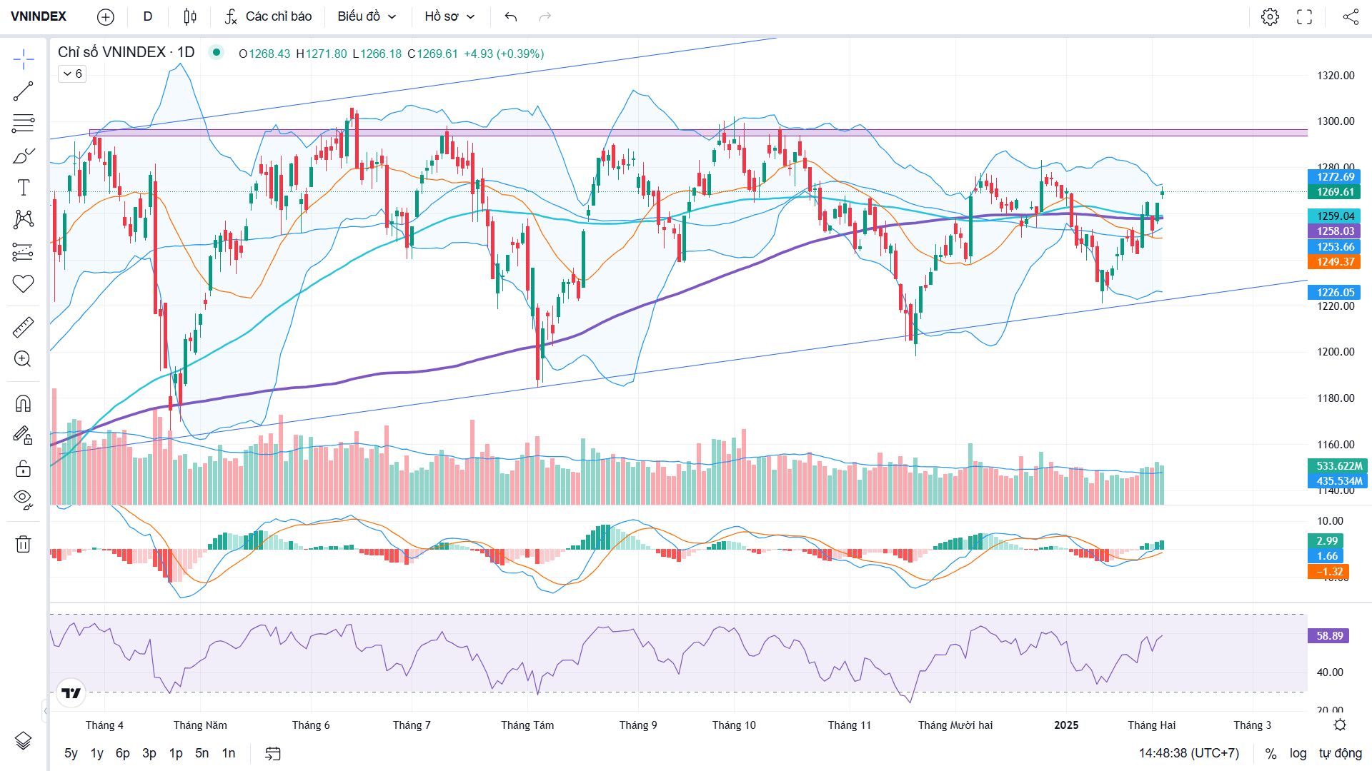 Phiên đầu tiên của năm 2025 mở màn khá thuận lợi. VnIndex rung lắc ở giữa phiên và hồi phục về cuối phiên, đóng cửa tại 1269.71đ (+2.93đ) trong khi Vn30 kết phiên ở 1343.20đ (-1.55đ).