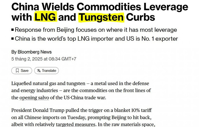 Tuy nhiên, Trung Quốc phản ứng quyết liệt hơn. Ngày 04/02/2025, Trung Quốc đáp trả bằng cách áp thuế lên mặt hàng năng lượng từ Mỹ. Cụ thể là áp thuế 15% lên than và khí hóa lỏng từ Mỹ, và áp mức thuế 10% lên dầu thô, thiết bị nông nghiệp và ô tô nhập khẩu. Đồng thời, Trung Quốc mở cuộc điều tra chống độc quyền nhằm vào các tập đoàn lớn của Mỹ và tuyên bố sẽ hạn chế xuất khẩu đất hiếm – nguyên liệu thiết yếu trong ngành bán dẫn và năng lượng sạch.