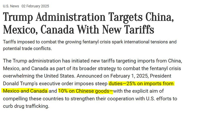 Vào ngày 01/02/2025, Tổng thống Donald Trump tuyên bố áp thuế 25% lên hàng hóa nhập khẩu từ Canada và Mexico, đồng thời tăng thêm 10% thuế đối với hàng hóa từ Trung Quốc.