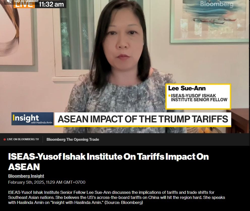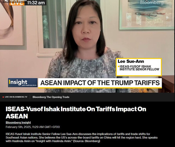 Lee Sue-Ann, chuyên gia cấp cao tại Viện ISEAS-Yusof Ishak, đã phân tích tác động của các biện pháp thuế quan và sự thay đổi thương mại đối với các quốc gia thuộc khu vực Đông Nam Á (ASEAN). Bà nhận định rằng, thuế quan mà Mỹ áp dụng rộng rãi lên Trung Quốc có thể ảnh hưởng nghiêm trọng đến khu vực ASEAN, bởi nhiều quốc gia tại đây phụ thuộc lớn vào chuỗi cung ứng và giao thương với Trung Quốc.