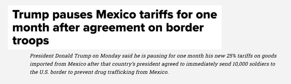 Trước áp lực này, Mexico và Canada đã nhanh chóng xuống nước gọi điện đàm phán với Mỹ. Kết quả, hai bên đạt thỏa thuận rằng Mỹ sẽ tạm dừng áp thuế mới trong vòng một tháng. Đổi lại, Mexico và Canada cam kết triển khai 10.000 binh sĩ để tăng cường kiểm soát biên giới, ngăn chặn nhập cư trái phép và các luồng chất cấm.