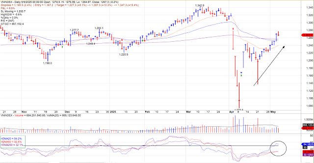 Thị trường đã phục hồi tốt và có 2 phiên đóng cửa trên EMA200; kịch bản hình thành sự phục hồi chữ V là chưa xảy ra nhưng nhịp tích lũy trở lại cho điểm số sẽ phù hợp hơn khi các đường trường bình ngắn hạn và trung hạn vẫn giao dịch dưới 200 phiên.