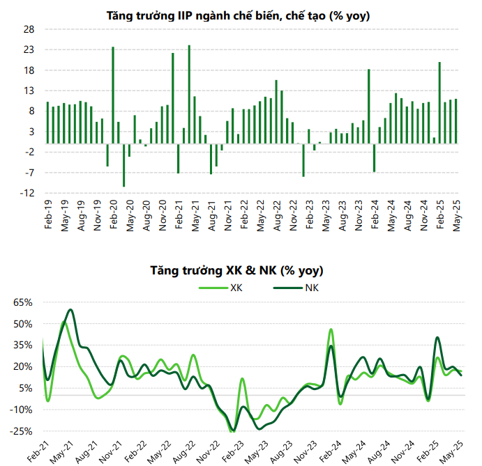 Xuất khẩu: Tháng 4-5 tăng mạnh 20,0%-14,0% yoy so với mức 10,6% trong Q1.2025. Các doanh nghiệp đẩy mạnh xuất hàng trong thời gian tạm hoãn Thuế 90 ngày.