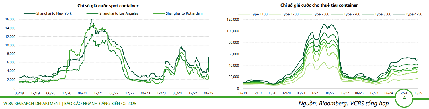 Giá cước giao ngay container khởi sắc trở lại: trong Q1.2025 giá cước vận tải container giảm kỷ lục, giá cước hàng XK đi TQ giảm mạnh 28% yoy, cước hàng XK từ Thượng Hải giảm mạnh 46%, rơi xuống mức thấp nhất kể từ năm 2024, do kết hợp với nhu cầu suy giảm và thay đổi từ các dịch vụ liên minh hãng tàu mới và tăng trưởng công suất đội tàu. Tuy nhiên sang T4 sau khi Mỹ công bố thời hạn hoãn Thuế đối ứng trong 90 ngày, nhu cầu front-load đã chứng kiến đợt phục hồi mạnh, và tăng mạnh gần đây. Hiện tại, sau 6 tuần tăng liên tiếp từ đầu tháng 5 (tăng ~70%), giá cước tuần 25 của container 40’ đã bắt đầu giảm 7% trong tuần này, cho thấy ảnh hưởng bởi front load sẽ không tác động lâu dài.