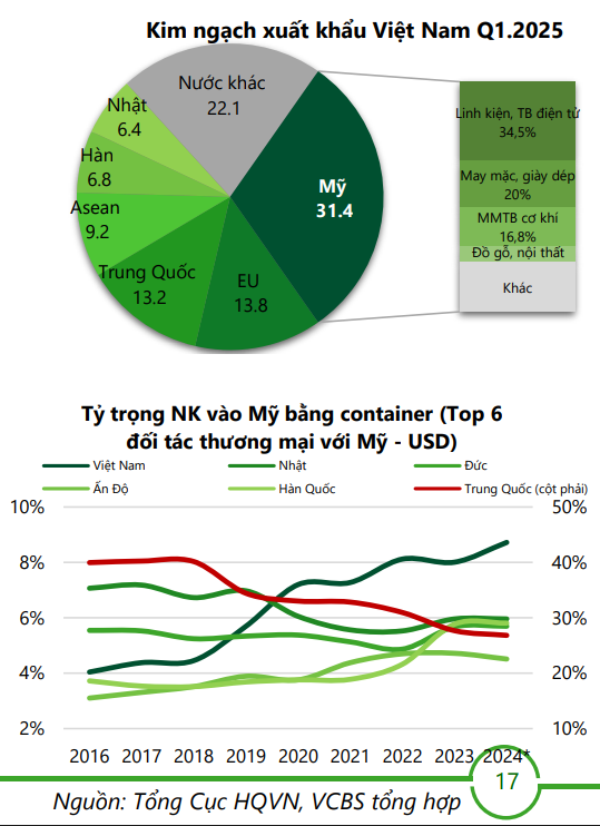 Trong 2H.2025, hoạt động xuất khẩu vẫn tiếp tục có nhiều biến động, tỷ trọng xuất khẩu đi Mỹ của hàng hóa Việt Nam chiếm khoảng 30% tổng kim ngạch XK, do đó biểu Thuế mới sau 90 ngày kể từ ngày 09/04/2025 sẽ tác động trực tiếp đến nhiều nhóm ngành hàng chính. Ngoài ra, các ngành chứng minh được nguồn gốc xuất xứ sẽ có thể hưởng mức thuế tích cực hơn so với mức thuế chung.