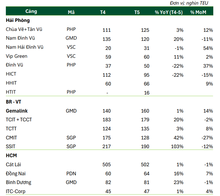 Tháng 4-5/2025: ước tính sản lượng container cả nước tăng ~ 13% yoy, dẫn đầu là tại (1) CM-TV mức tăng 22% yoy, (2) Hải Phòng: cụm cảng nước sâu Lạch Huyện +32% yoy, cụm cảng sông chỉ tăng 1% yoy và (3) HCM tăng 8% yoy.