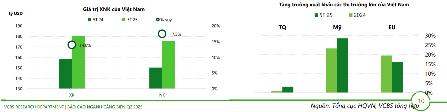 Xuất khẩu: thị trường Mỹ tháng 4-5 tăng mạnh 34%-36% yoy so với mức 18,3% trong Q1.2025, XK sang EU tăng 13%-15% yoy.