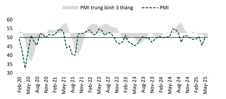 PMI: tháng 5/2025 PMI giảm xuống dưới ngưỡng 50 điểm đạt 49,8 điểm, tăng đáng kể sv T4 ở mức 45,6 điểm. Cho thấy sự cải thiện và gần như ổn định sau 2 tháng liên tiếp dưới 50 điểm.