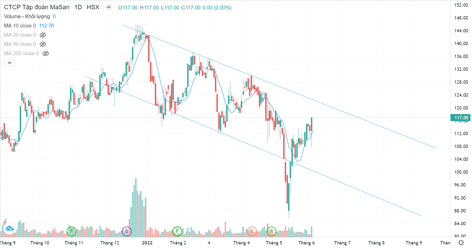 Đầu năm 2022, Cổ phiếu của Tập đoàn Masan luôn giao động trong vùng kháng cự và hỗ trợ và đang có xu hướng giảm. Theo như biểu đồ dưới đây, cổ phiếu của Masan đã dao động để cố phá vỡ vùng hỗ trợ từ ngày 13-18/5. Tuy nhiên, biến động mạnh đó lại đang có xu hướng quay về vùng kháng cự và hỗ trợ cũ, chứ chưa bị phá vỡ để tạo một vùng kháng cự mới.