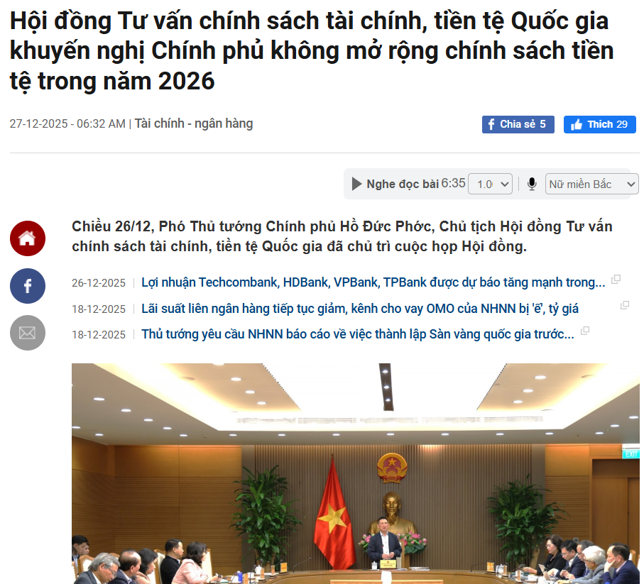 Nhìn vào báo cáo mới nhất, Phó Thủ tướng Hồ Đức Phớc và Hội đồng đã đưa ra khuyến nghị cực kỳ quan trọng: Không mở rộng chính sách tiền tệ trong năm 2026. Tại sao lại như vậy khi mục tiêu tăng trưởng GDP là hơn 10%?