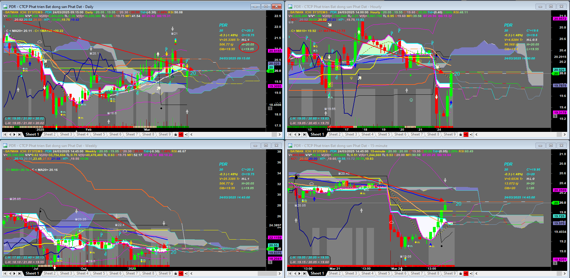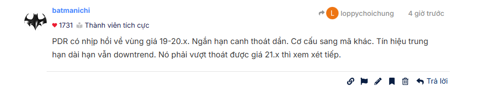 PDR có nhịp hồi về vùng giá 19-20.x. Ngắn hạn canh thoát dần. Cơ cấu sang mã khác. Tín hiệu trung hạn dài hạn vẫn downtrend. Nó phải vượt thoát được giá 21.x thì xem xét tiếp.