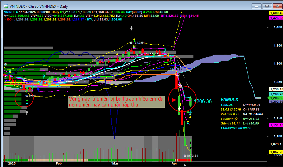 VNI phục hồi được 12-13%. Về tới vùng kháng cự 1206-1208.x Phiên chiều nay phải chiến đấu với hàng bắt đáy về. Áp lực chốt lời ở dưới và cắt lỗ ở trên đè nặng phiên chiều nay. Khá căng vì tỉ lệ lãi đã trên 10% rồi.