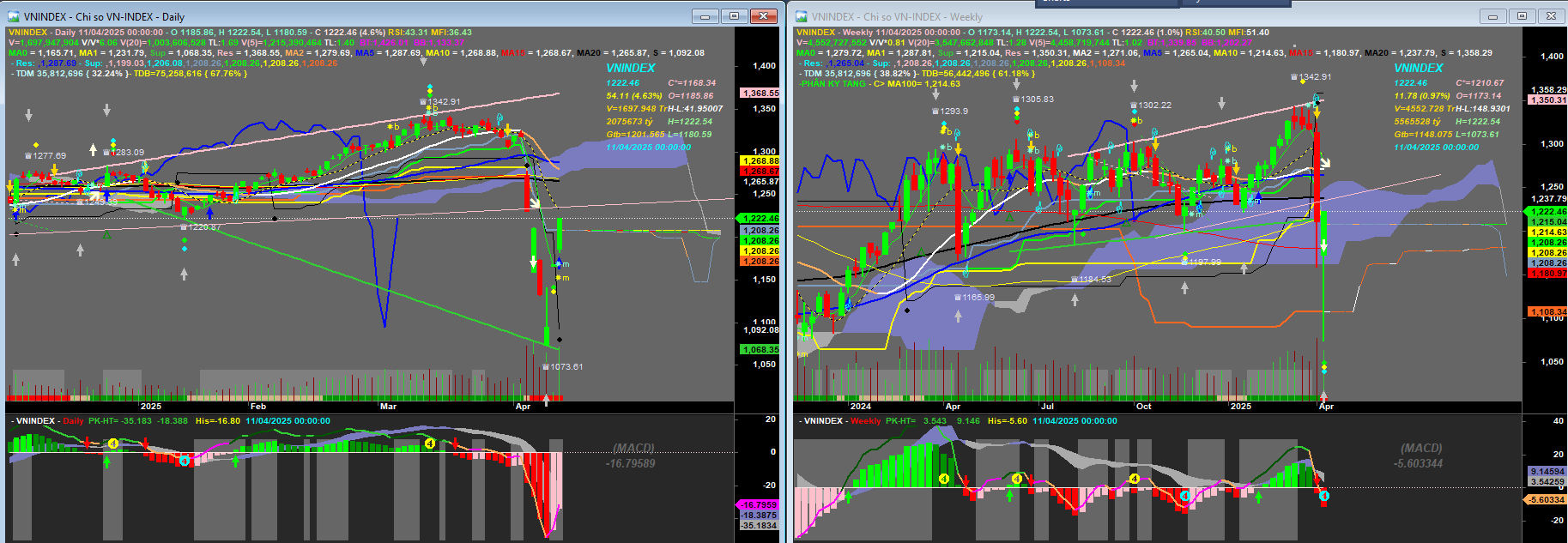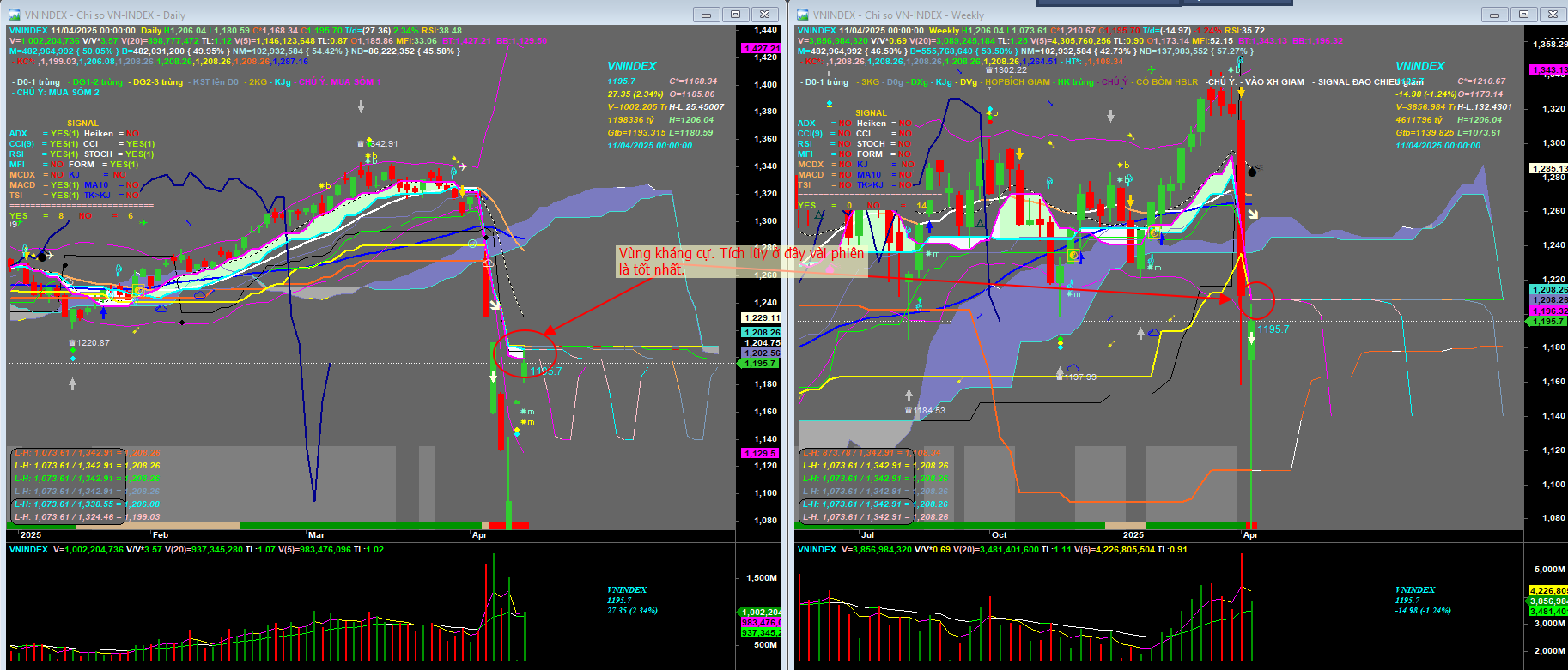 Tín hiệu tốt đã có trở lại. Theo chart thì thị trường tiếp tục vừa hồi phục vừa rung lắc tạo cảm giác rất khó chịu. 2 kháng cự cần vượt qua là MA200 1237.79 chart W và 1229.21 kháng cự gap ngày. Xa hơn là MA200 chart D 1266.x. Xa hơn nữa là tới cái gap 1277.x (cách giá hiện tại 55đ) Cần lưu ý là không còn điểm mua hàng mới nữa. Chỉ trade T0 T1 hàng có sẵn thôi. Mua mới thì ráng chờ nhịp test lại của thị trường.
