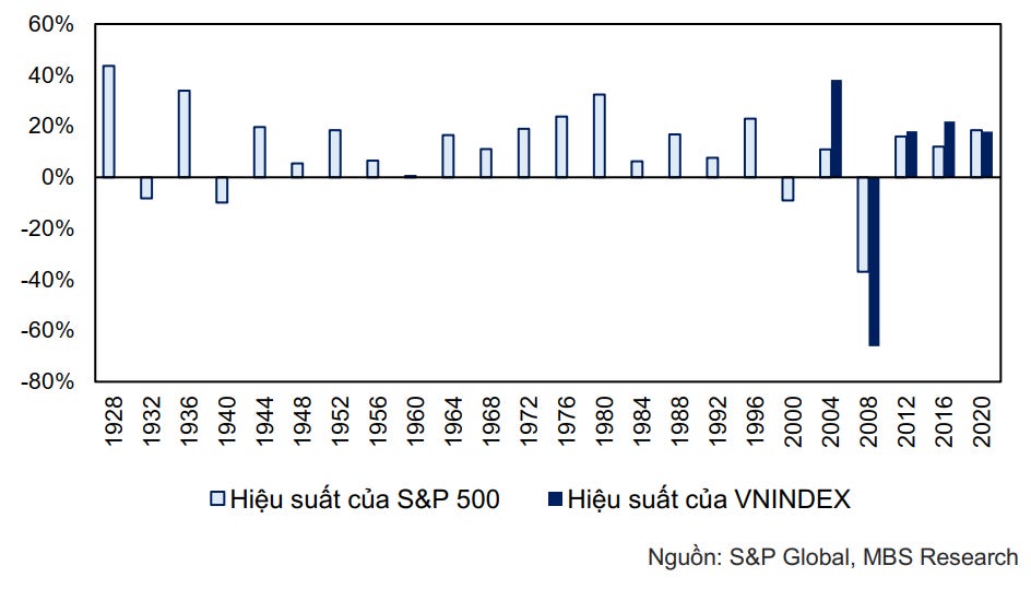 Trong giai đoạn 1928 – 2020 cũng cho thấy 20/24 lần diễn ra bầu cử S&P500 đều tăng điểm. Bốn lần giảm điểm đều rơi vào thời điểm thị trường gặp phải các sự kiện THIÊN NGA ĐEN lớn như năm 1932 (Đại suy thoái), 1940-1944 (Thế chiến II), 2000 (Sự sụp đổ của bong bóng dotcom) và 2008 (Khủng hoảng tài chính toàn cầu). Vào năm 2008, S&P500 có mức sụt giảm mạnh ~37%, ba lần sụt giảm còn lại đều không quá 10%.
