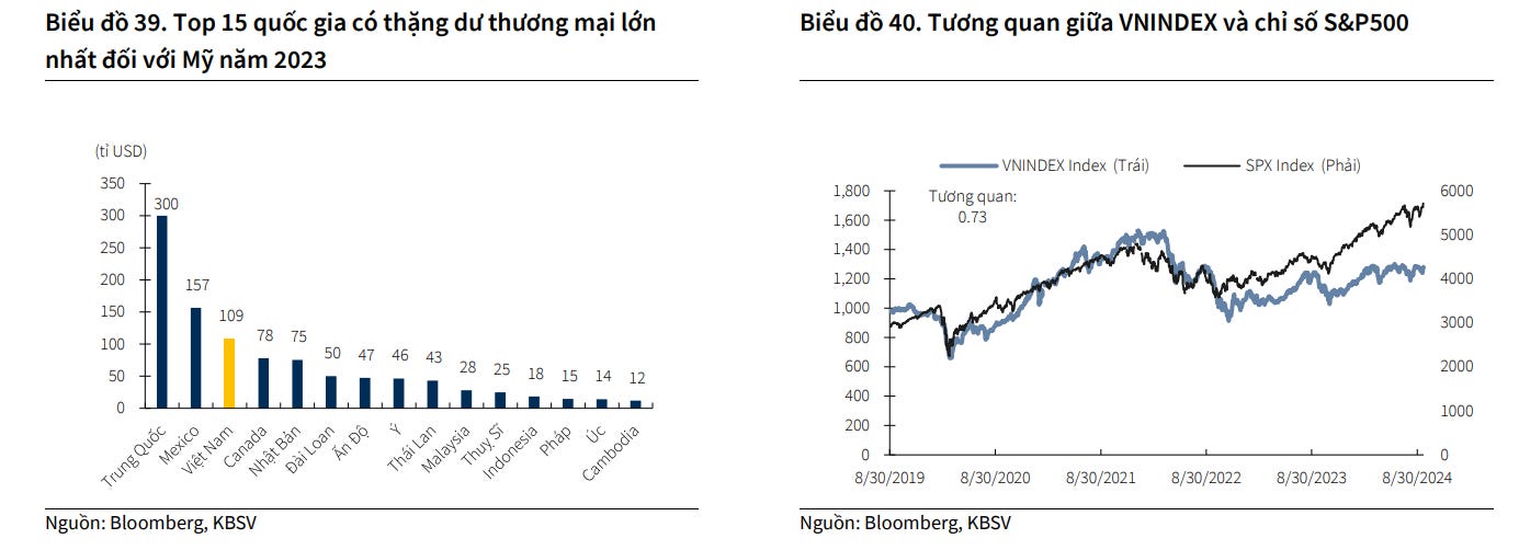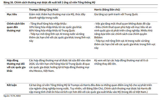 Theo KBSV, kịch bản ông Trump tái đắc cử có thể mang lại nhiều rủi ro với Chứng khoán Việt Nam hơn do các yếu tố như chủ nghĩa bảo hộ thương mại có thể quay trở lại mạnh mẽ và Việt Nam có thể lọt vào tầm ngắm do thặng dư thương mại với Mỹ ở mức cao.