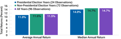 Theo thống kê của Bloomberg, mặc dù biến động có gia tăng trước ngày bầu cử diễn ra, nhìn chung những năm bầu cử là tốt cho TTCK khi S&P500 tăng hầu hết trong các năm bầu cử . Hiệu suất giữa năm bầu cử và không bầu cử không chênh lệch quá nhiều.