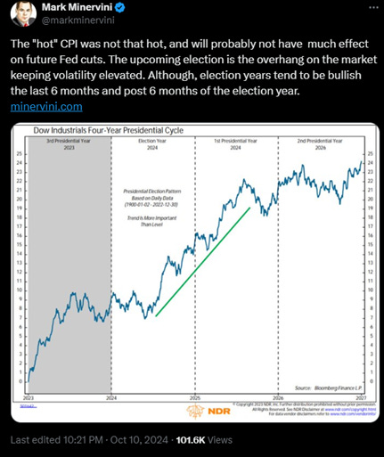 Trong một tweet gần đây của Mark Minervini , ông cho rằng “chỉ số CPI không nóng lắm và có thể không ảnh hưởng nhiều đến việc cắt giảm lãi suất của FED trong tương lai. Cuộc bầu cử sắp tới là gánh nặng với thị trường, khiến độ biến động tăng cao. Mặc dù, các năm bầu cử thường tăng giá trong 6 tháng cuối và sau 6 tháng của năm bầu cử. ”