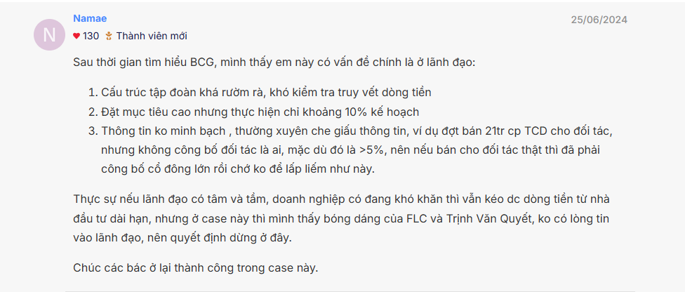 Với 1 người đã từng mất người thân trên ttck, cũng do không chịu được áp lực khi bị phá sản, do quyết định đầu tư vào các cty có lãnh đạo bẩn, tương tự như BCG, nên mình luôn đặt tiêu chí lãnh đạo lên đầu tiên khi chọn cp. Hãy nhớ 1 điều, khi chọn lãnh đạo có đức, thì dù mua sai thời điểm vẫn tốt hơn rất nhiều so với lãnh đạo thất đức.