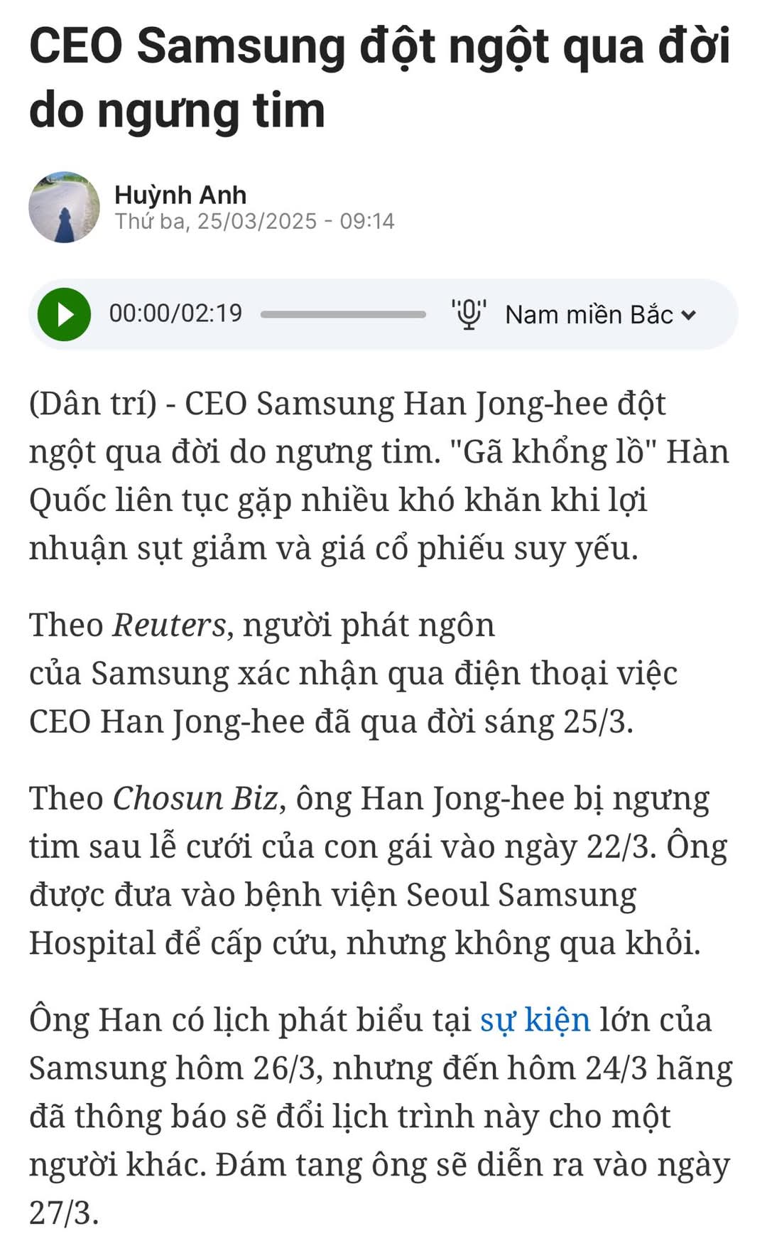 Bác CEO của Samsung cũng ra đi ở tuổi 63 và cũng vì nguyên nhân tắc mạch máu nuôi tim như bác chủ tịch BCG.