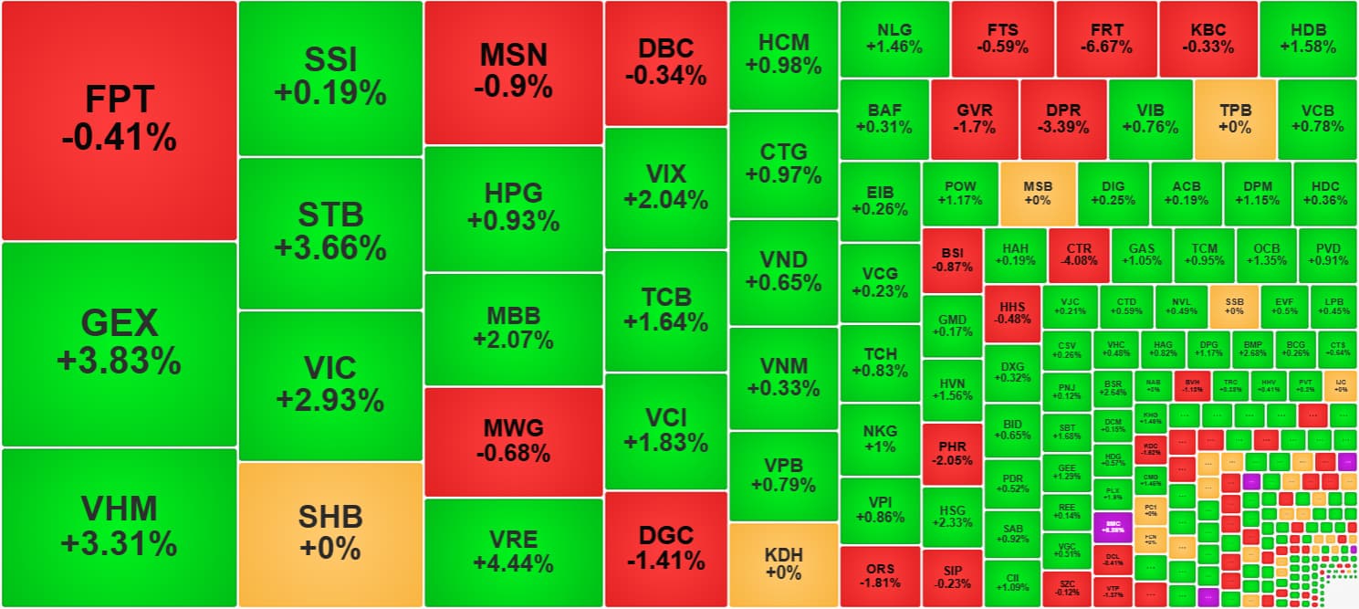 Dù vậy cuối ngày chỉ số cũng tăng 10,47 điểm (+0,8%) lấy lại gần như toàn bộ mức giảm hôm qua (-10,6 điểm).