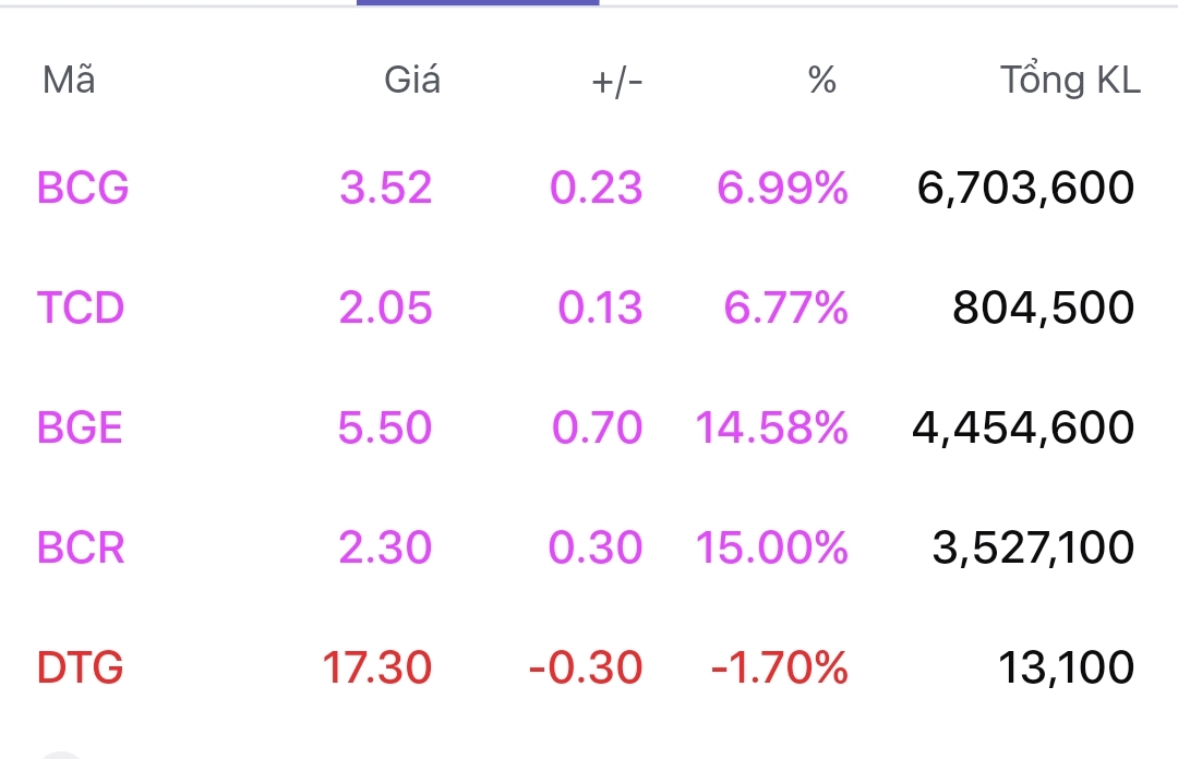 Sự tăng tím hai phiên liên tiếp của BCG, BCR, BGE, TCD là nằm ngoài diễn biến chung của nhóm cp có thị giá dưới 10k.
