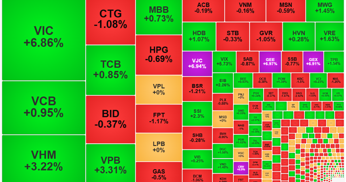 Điểm nhấn hôm nay là dòng tiền vào blue-chips tăng rõ nét. VN30 tăng giao dịch 30% so với phiên trước và tăng 52% so với trung bình 20 phiên tính theo giá trị. Nhóm này cũng chiếm 62,4% tổng giá trị khớp của HSX trong ngày. Sàn này cũng tăng thanh khoản 41% so với trung bình 20 phiên.
