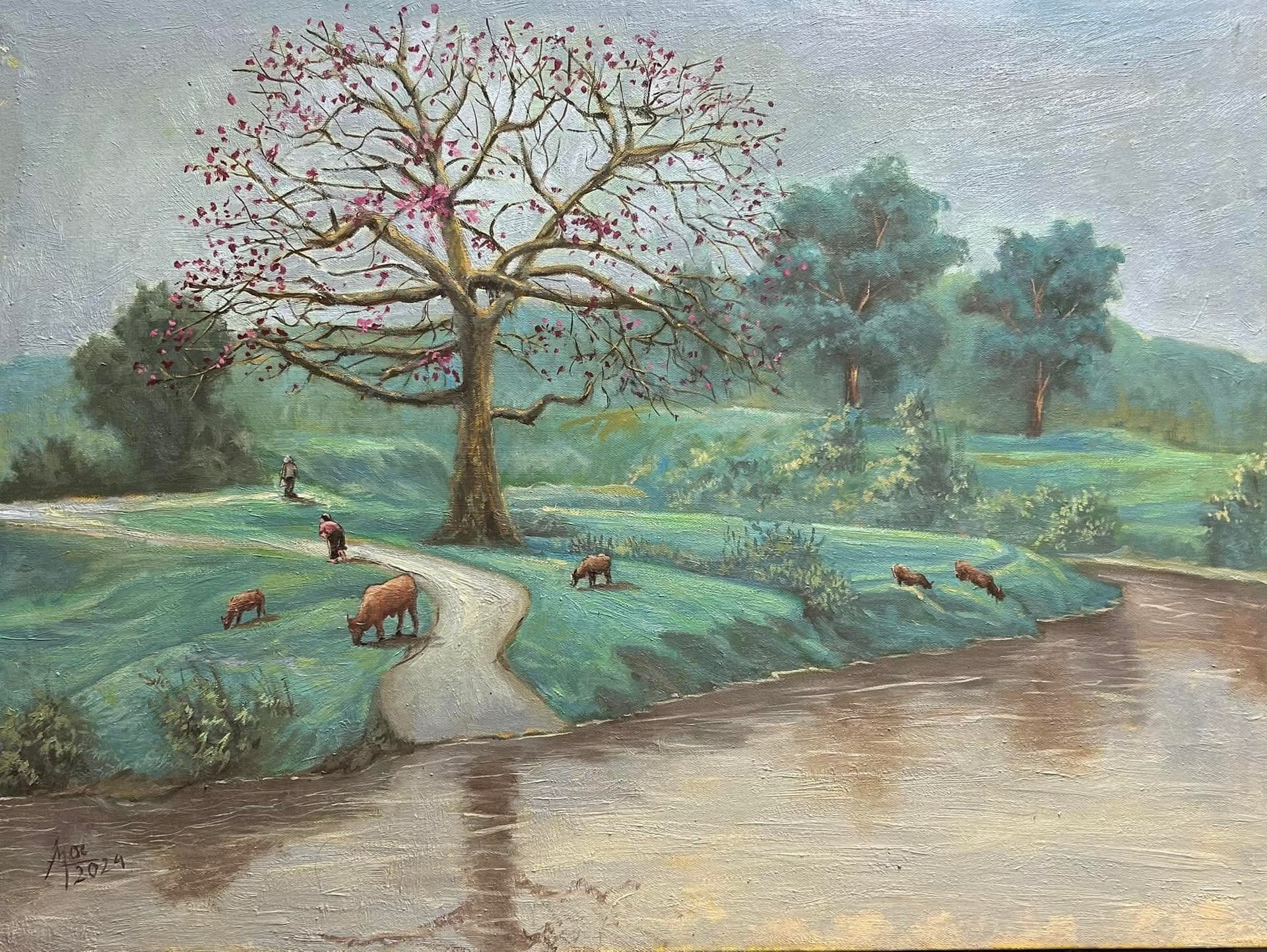 Cầm cành hoa đứng ngay đầu ngõ
