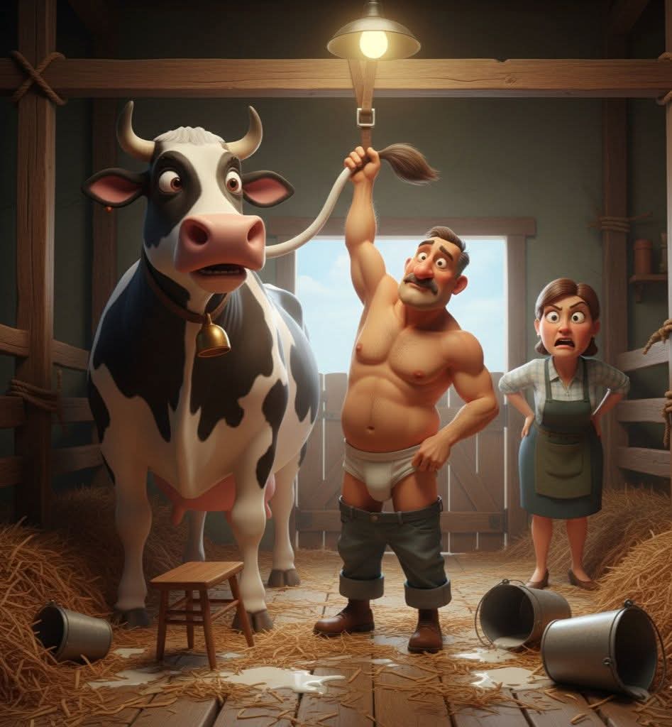 — Tôi lấy dây trói nốt cái chân phải nó vào cái cột bên kia. Thế là xong nhé, hết đường quậy. Tôi ngồi xuống vắt lần thứ ba… Mọi chuyện đang ngon lành cành đào… thì đùng một cái, con bò chết tiệt ấy nó quất cái đuôi một phát như roi điện, xô sữa lại đổ sạch lần nữa!