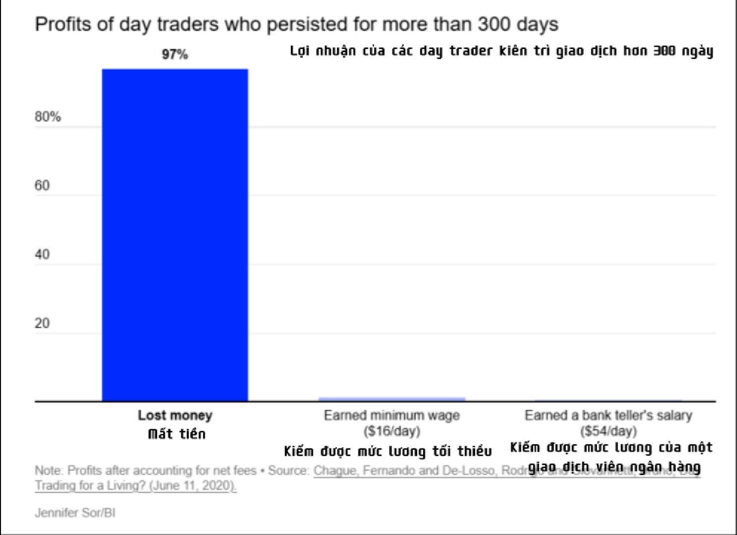 97% day trader thua lỗ sau hơn 300 ngày giao dịch. Chỉ một nhóm cực nhỏ kiếm được mức thu nhập ngang lương tối thiểu mỗi ngày và gần như không ai đạt được mức thu nhập ổn định như một công việc bình thường.