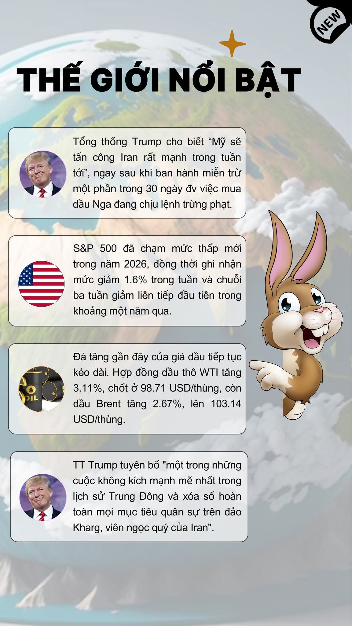 Thị trường vừa đóng cửa được mấy tiếng, thì Donald Trump đã cho đánh bom đảo Kharg . với tuyên bố đây là cuộc đánh bom mạnh mẽ nhất Trung Đông.