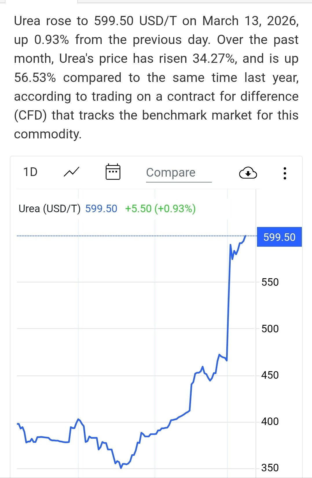 Trong một tháng qua, giá urê đã tăng 34,27%, và cao hơn 56,53% so với cùng thời điểm năm ngoái, theo dữ liệu giao dịch từ hợp đồng chênh lệch (CFD) theo dõi thị trường chuẩn của mặt hàng này.