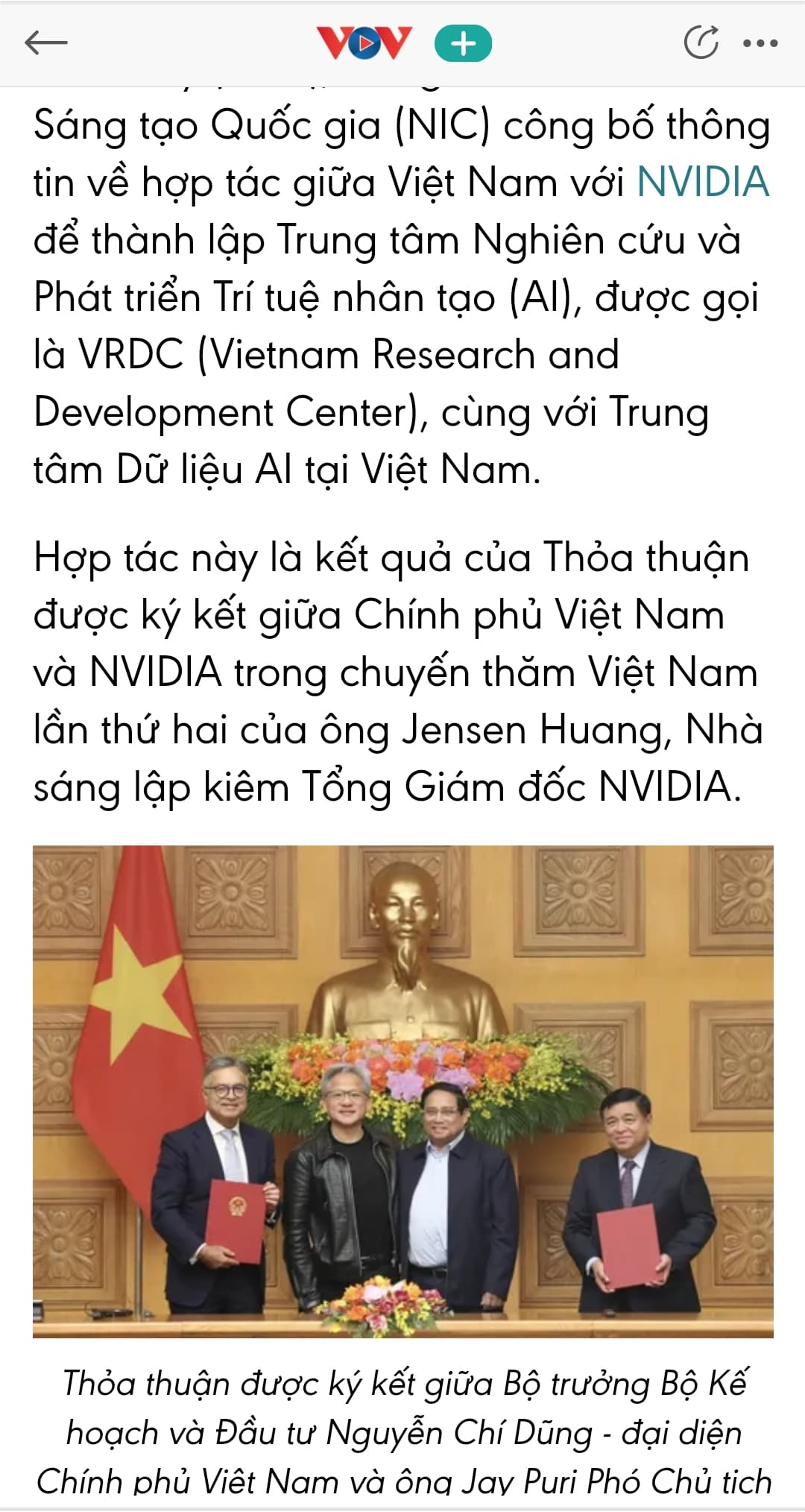 Chủ tịch NVIDIA Jensen Huang khẳng định thế giới công nghệ đang khởi động lại vì trí tuệ nhân tạo, đây là cơ hội tuyệt vời, thời điểm quan trọng của Việt Nam khi ngành trí tuệ nhân tạo đang trải qua những thay đổi sâu sắc nhất, thúc đẩy phát triển các ngành công nghiệp mới, dịch vụ mới, sản phẩm mới, doanh nghiệp mới, thúc đẩy tăng trưởng.