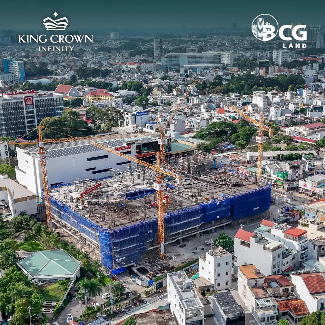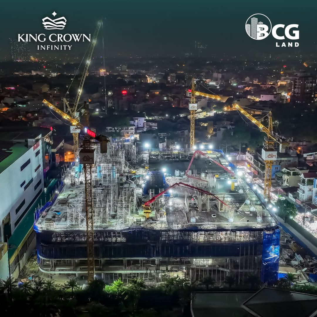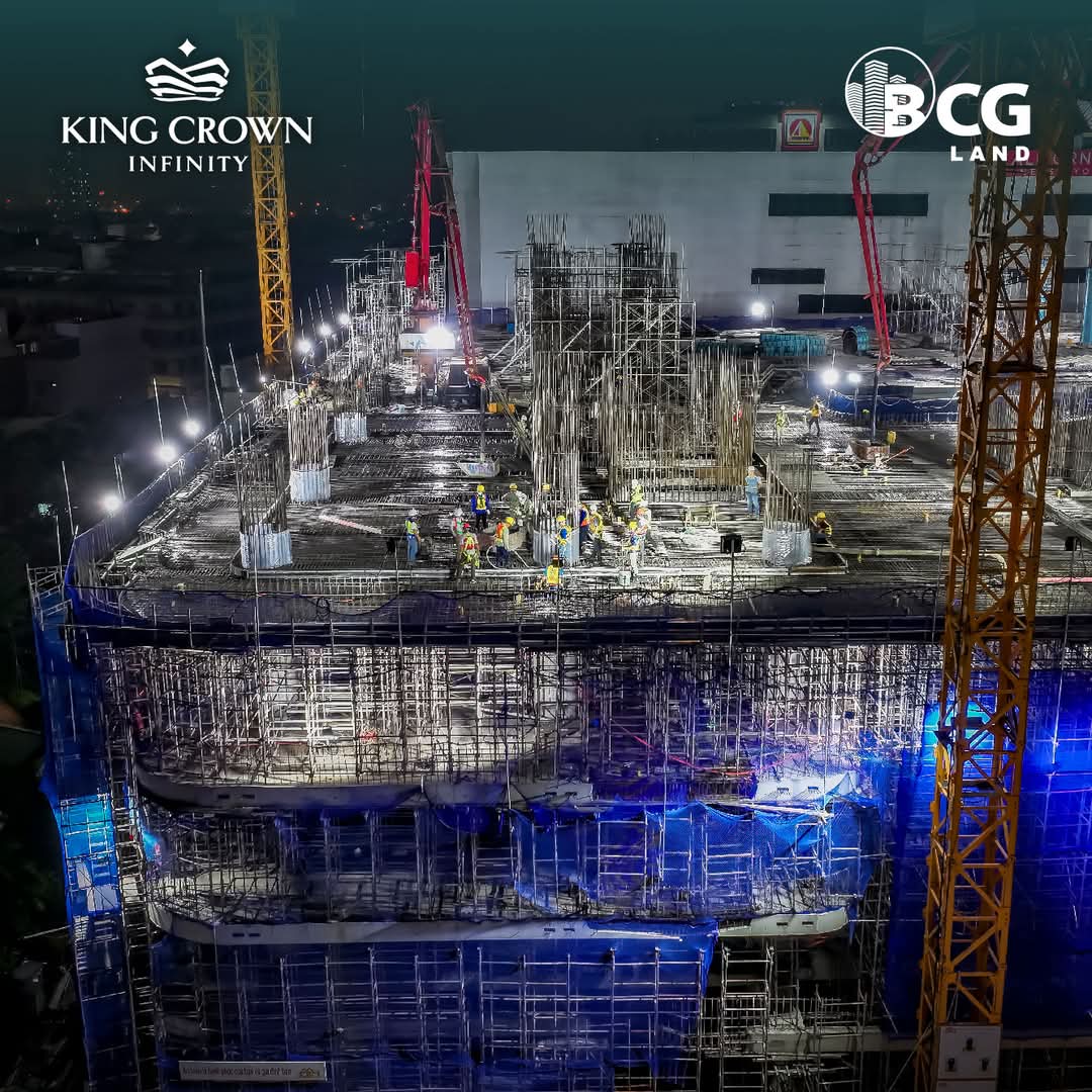 King Crown Infinity đang đẩy mạnh tiến độ thi công cả ngày lẫn đêm, hướng tới cột mốc hoàn thiện phần thô khối đế thương mại trước thềm Tết nguyên đán.