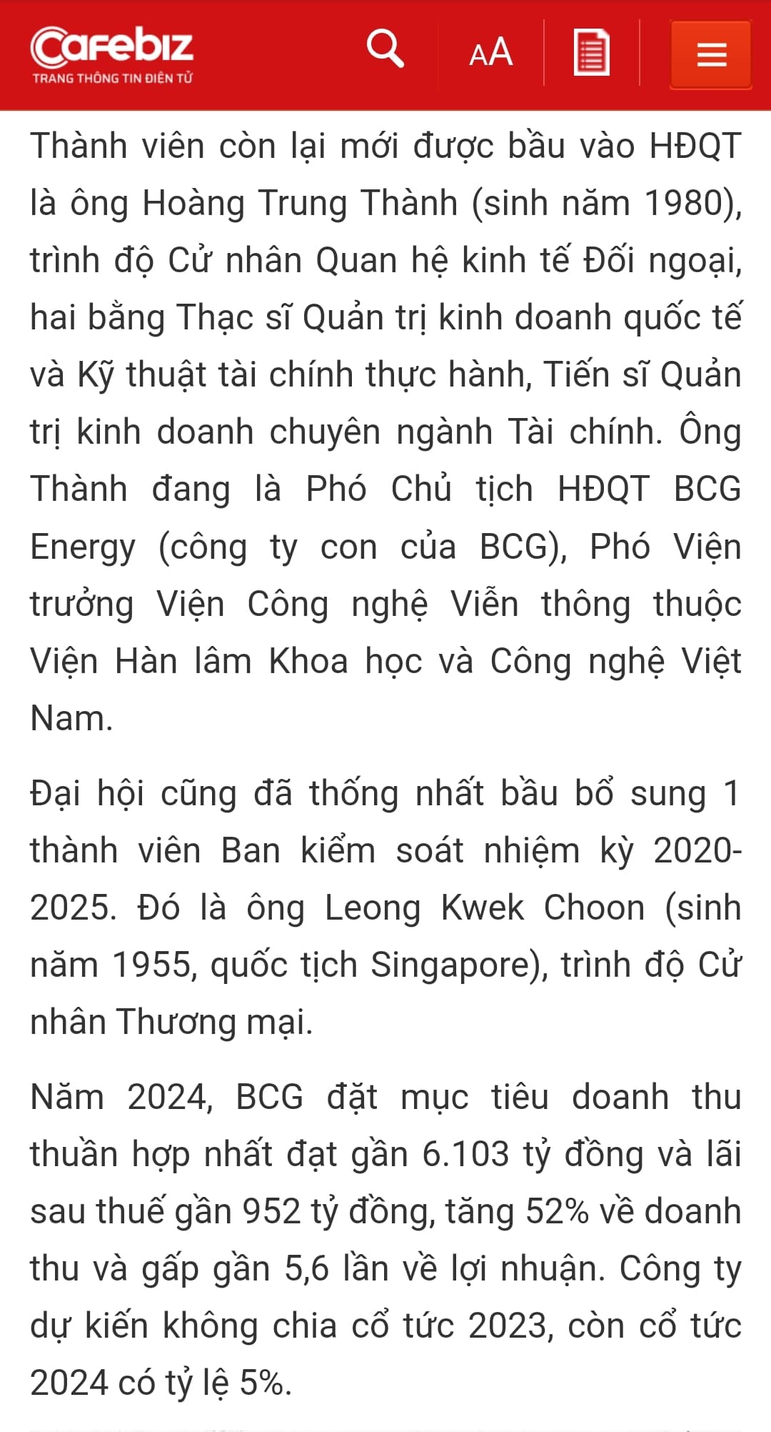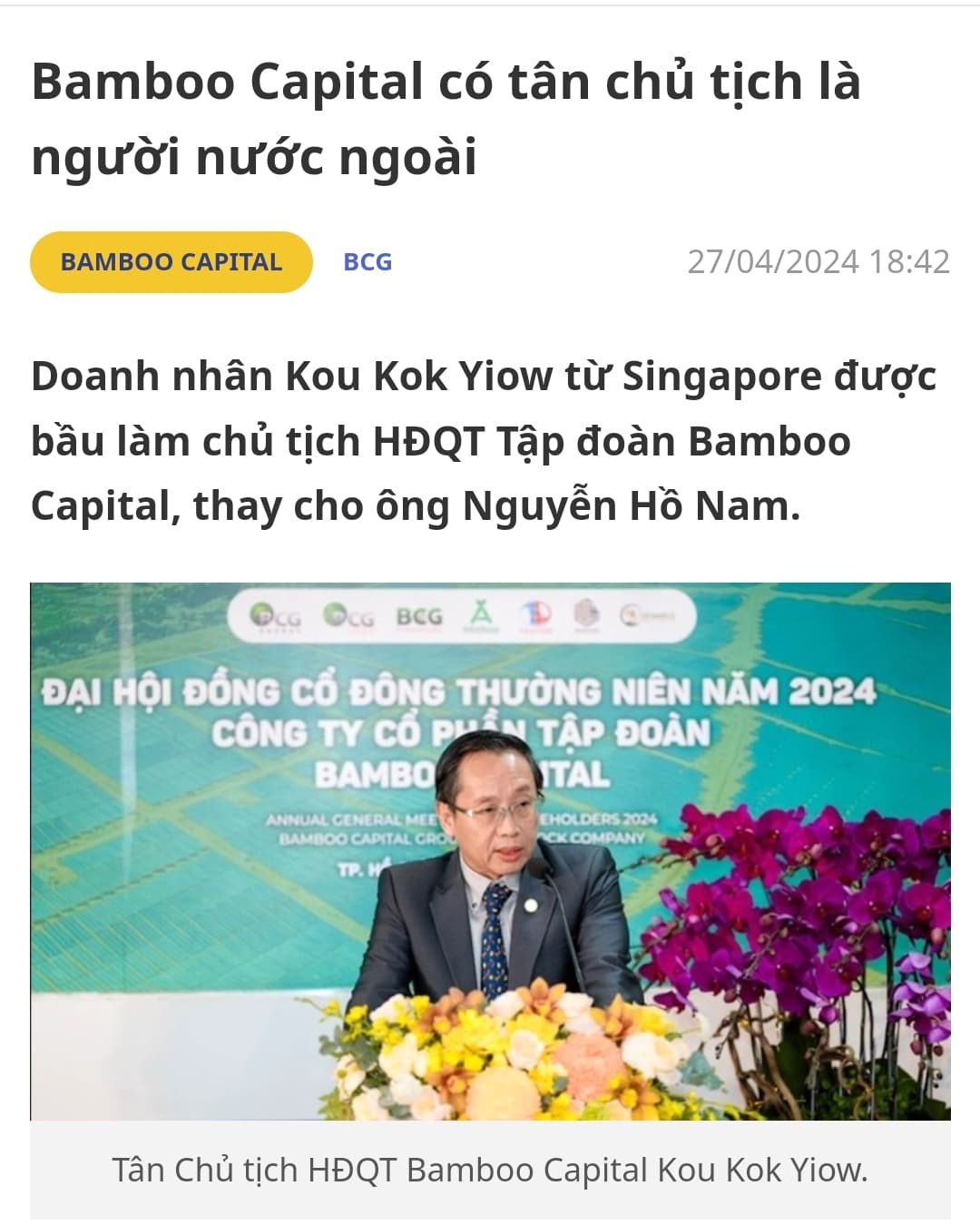 Ông Kou Kok Yiow, quốc tịch Singapore, sinh năm 1962, có trình độ cử nhân ngành kế toán, từng là thành viên Ban kiểm soát BCG từ giữa năm 2020. Trước thềm ĐHĐCĐ thường niên 2024, ông xin thôi chức để tham gia ứng cử vào HĐQT.