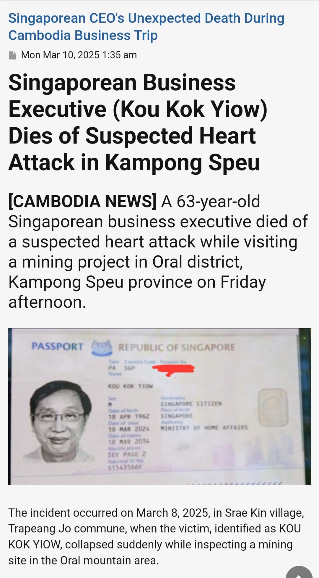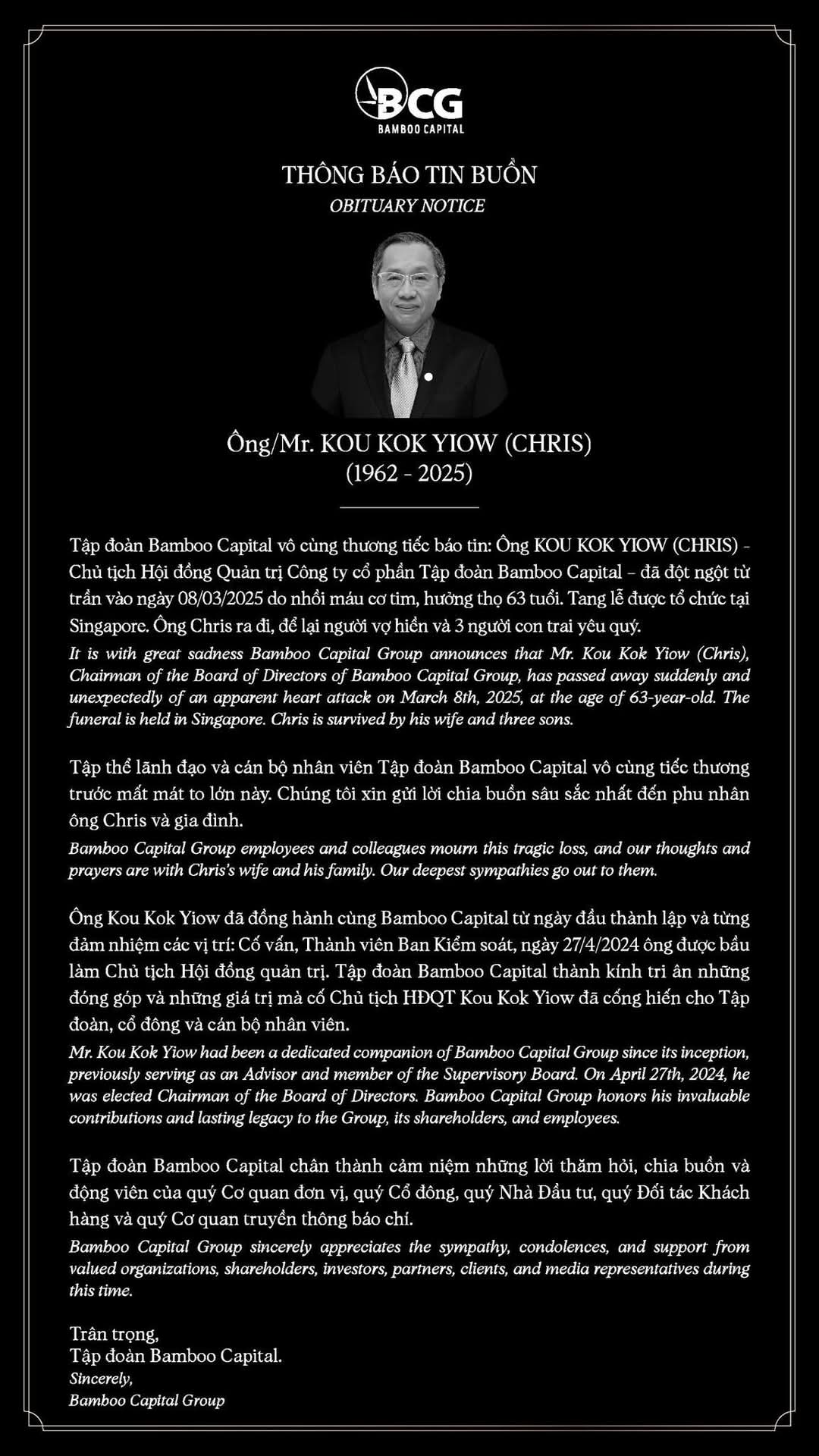 It is with great sadness Bamboo Capital Group announces that Mr. Kou Kok Yiow (Chris), Chairman of the Board of Directors of Bamboo Capital Group, has passed away suddenly and unexpectedly of an apparent heart attack on March 8th, 2025, at the age of 63-year-old. The funeral is held in Singapore. Chris is survived by his wife and three sons.