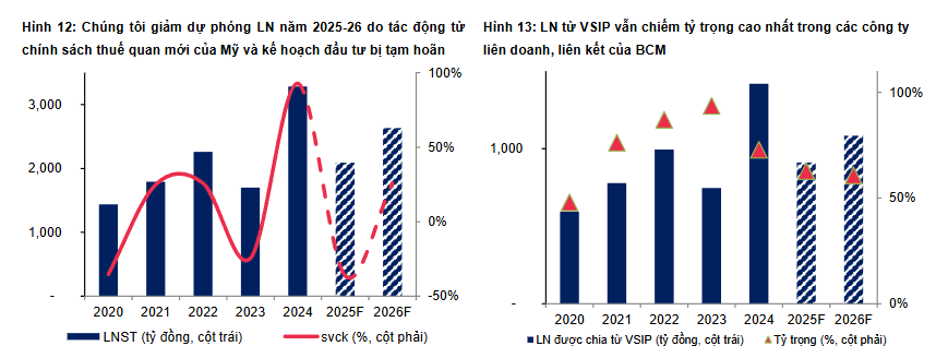 VSIP cho thuê được 150-200 ha năm 2023-24, nhưng sang năm 2025-26, do tác động từ chính sách thuế quan mới của Mỹ và kế hoạch đầu tư xây dựng bị hoãn lại, nên dự phóng diện tích cho thuê giảm xuống 115 ha/ 172 ha (-23%/ -9% so với báo cáo trước) và giảm mức tăng giá thuê xuống 0-3%/năm (thay vì mức 5-10% trong dự phóng trước). Qua đó, giảm dự phóng LN xuống 7%/ 16% so với báo cáo trước, đạt 2,091 tỷ đồng (-36% svck)/ 2,633 tỷ đồng (+26% svck).